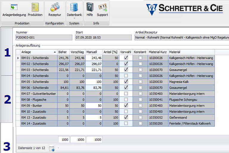 Über die Silobelegung lässt sich nachverfolgen, welches Material bzw. welcher Rohstoff sich in welchem Silo befindet. Der Anwender kann für die Produktion vorkonfigurierte Mandanten die Artikel sowie die Rezeptur einfach auswählen und Einsatzmengen vorbelegen. In der Produktion können die vorangelegten Produktionsaufträge ausgewählt, gestartet und gesteuert werden. Auf Basis der gewählten Rezeptur und der Anlagenbelegung ermittelt das System, welche Einsatzmengen aus welchen Anlagen verwendet werden können. Die vorgegebenen Werte werden über eine Schnittstelle an das am Produktionsstandort vorhandene Produktionsleitsystem übergeben.